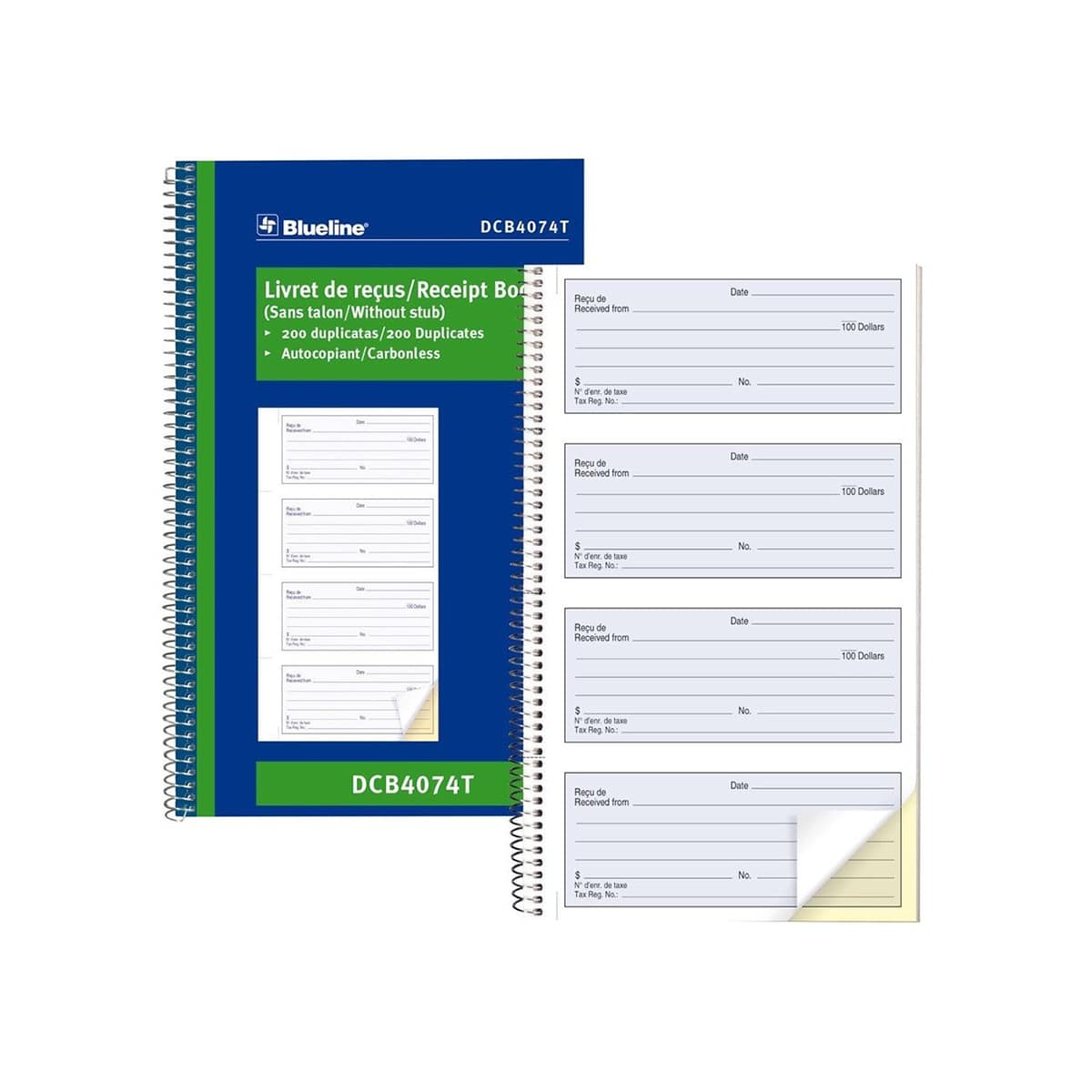 Couverture flexible avec reliure spirale. 4 reçus à la page. Autocopiant. 10-5/8 x 6-5/8 po. Non numérotés, 200 reçus, 2 copies. bilingue
