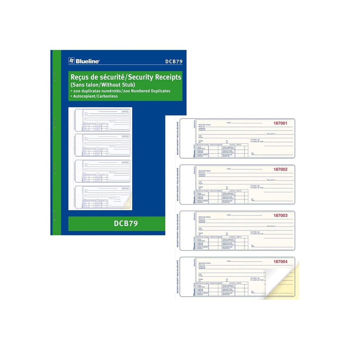 Reçus numérotés autocopiants, avec espace de description. 2 copies. 200 reçus. 10-7/8 x 8 po bilingue
