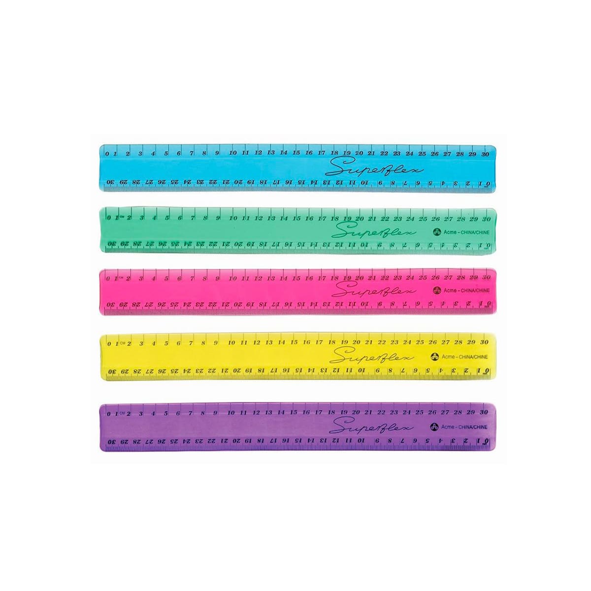 Vinyle ultra flexible et translucide. Double biseau. Un côté en millimètres, l’autre en centimètre. 5 couleurs brillantes : jaune, rose, bleu, vert et violet. Choix de couleur en magasin seulement.