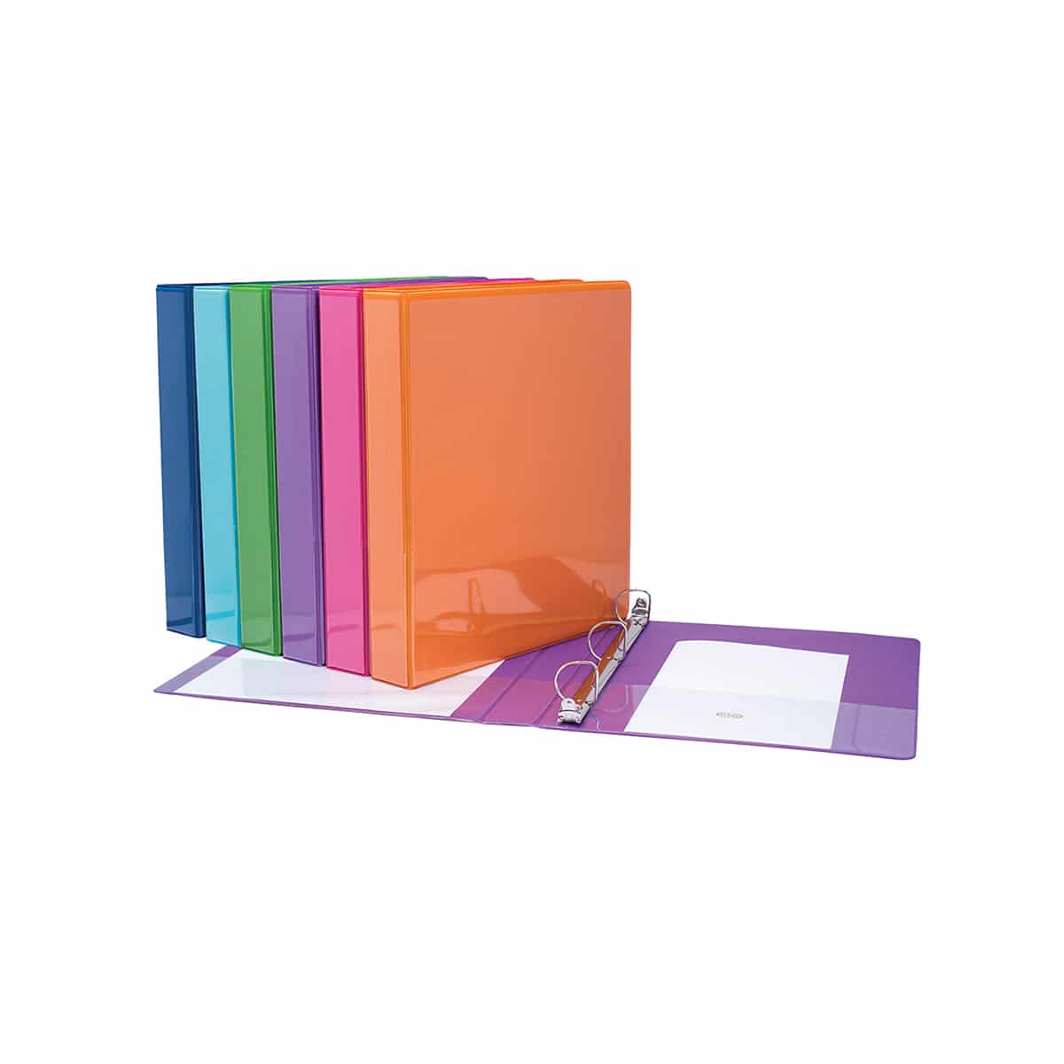 Reliure de présentation avec anneaux en « D » de 1″, pochettes de présentation sur tous les côtés, 2 pochettes intérieures.