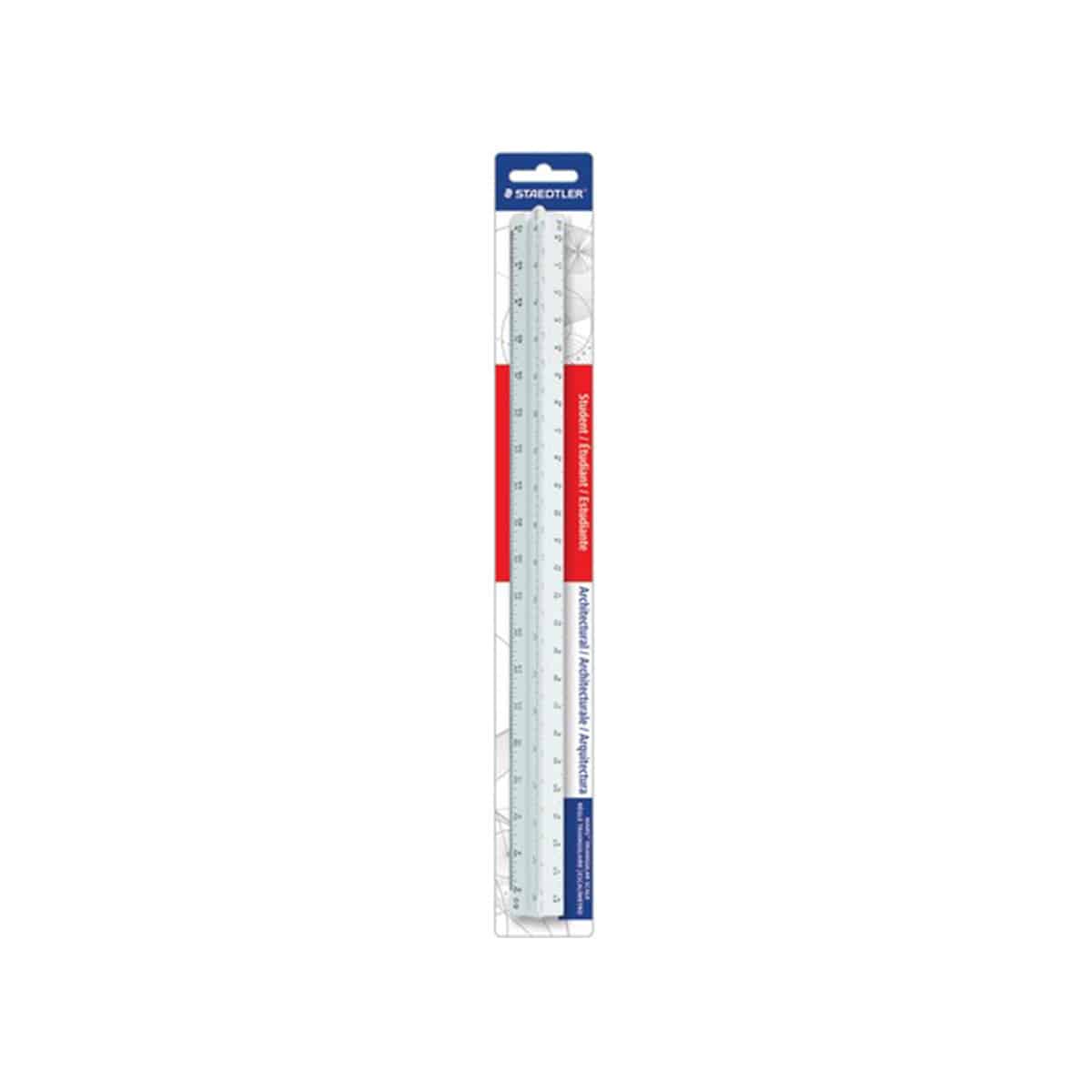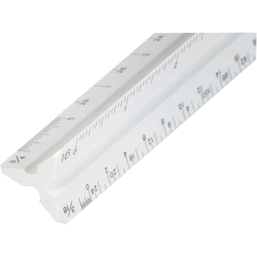 Trois côtés avec six échelles différentes comportent des graduations gravées à la matrice. Les graduations imprimées faciles à lire ne s’effacent pas. L’échelle triangulaire d’architecte est divisée en deux parties : 3/32″, 1/8″, 3/16″, 1/4″, 3/8″, 1/2″, 3/4″, 1″, 1-1/2″, 3″ = 1′. Les mesures sont entièrement divisées en pouces jusqu’au 16e. L’échelle triangulaire est fabriquée en plastique polystyrène résistant aux chocs.