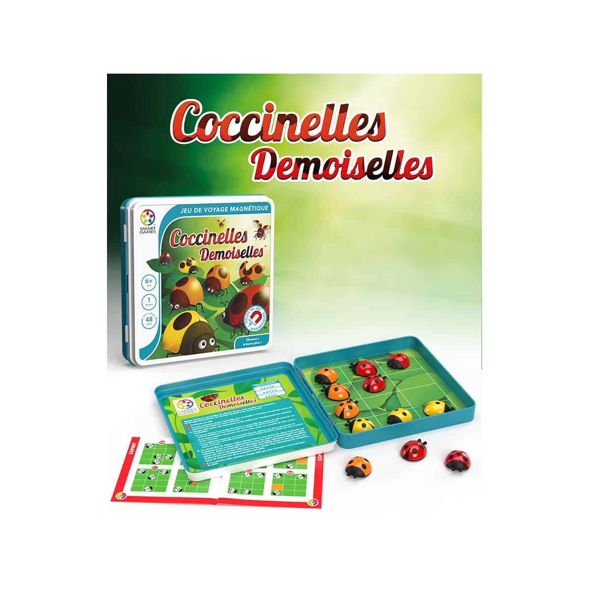 « Coccinelles Demoiselles » est un jeu magnétique de déduction dans lequel vous devrez trouver où poser vos coccinelles sur les feuilles de l’arbre. L’ordre prescrit tient compte de la couleur des trois familles et des valeurs numériques de chaque coccinelle représentées par le nombre de points sur leur dos.
