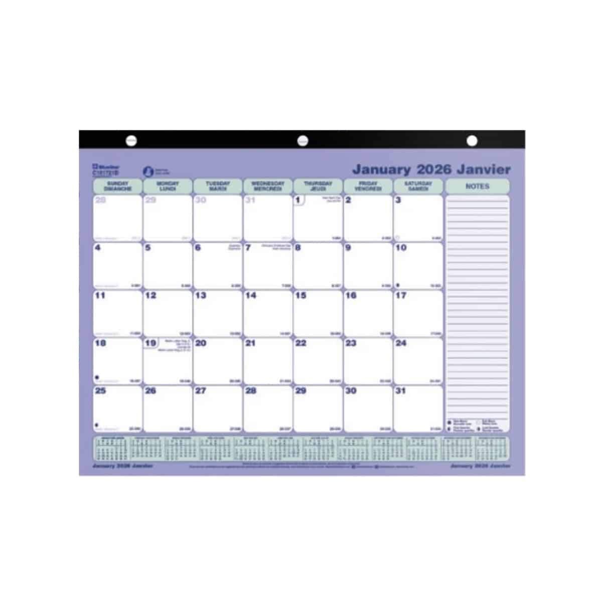 Janvier à décembre. Une feuille détachable par mois. Support de carton et coins renforcés. Calendrier annuel au bas de chaque page. Section de notes sur le côté. Un bloc par jour. 11 x 8-1/2 po bilingue