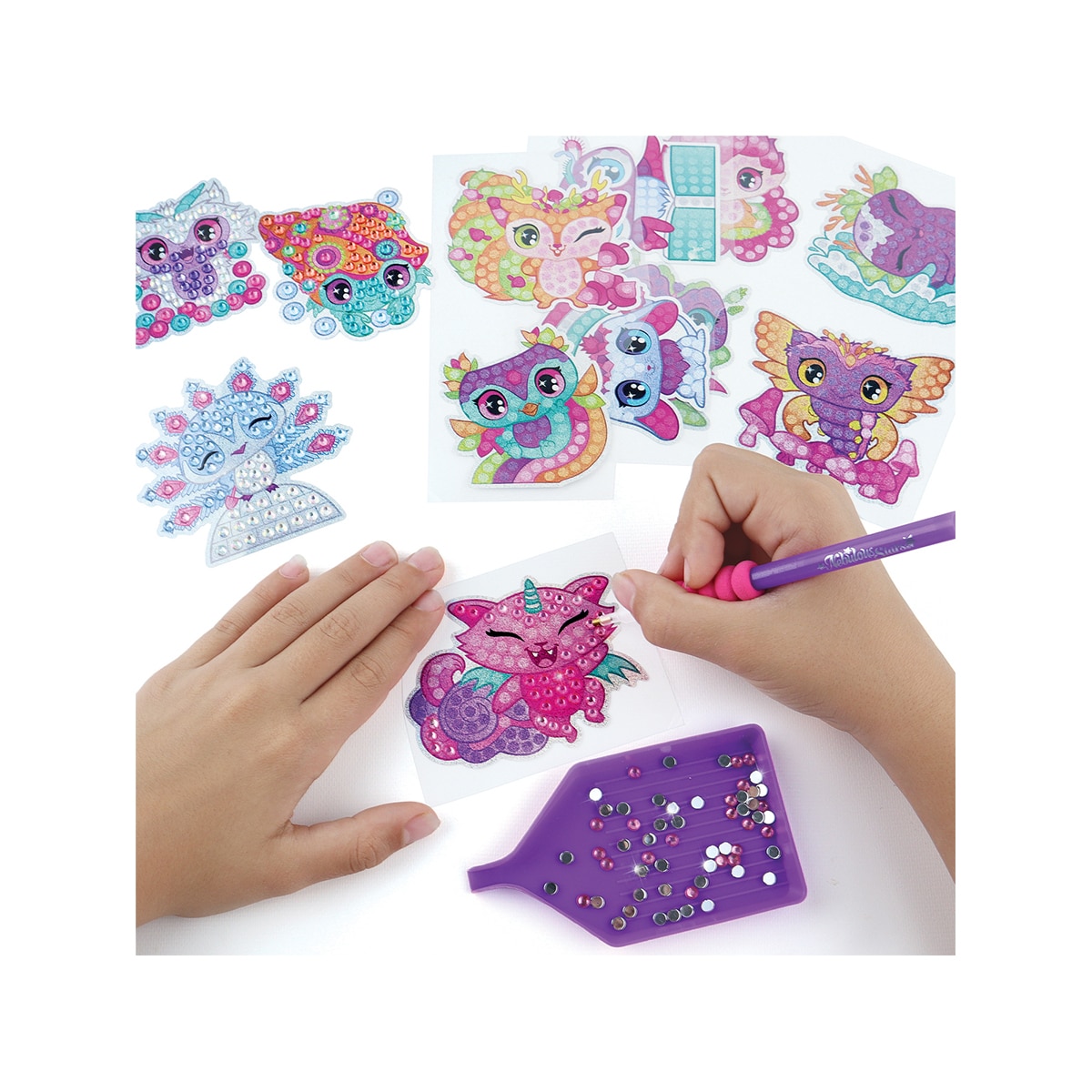 Crée 12 autocollants éblouissants! Colle des microstrass avec l’applicateur spécial sur les modèles préencollés pour obtenir de magnifiques autocollants texturés et brillants.